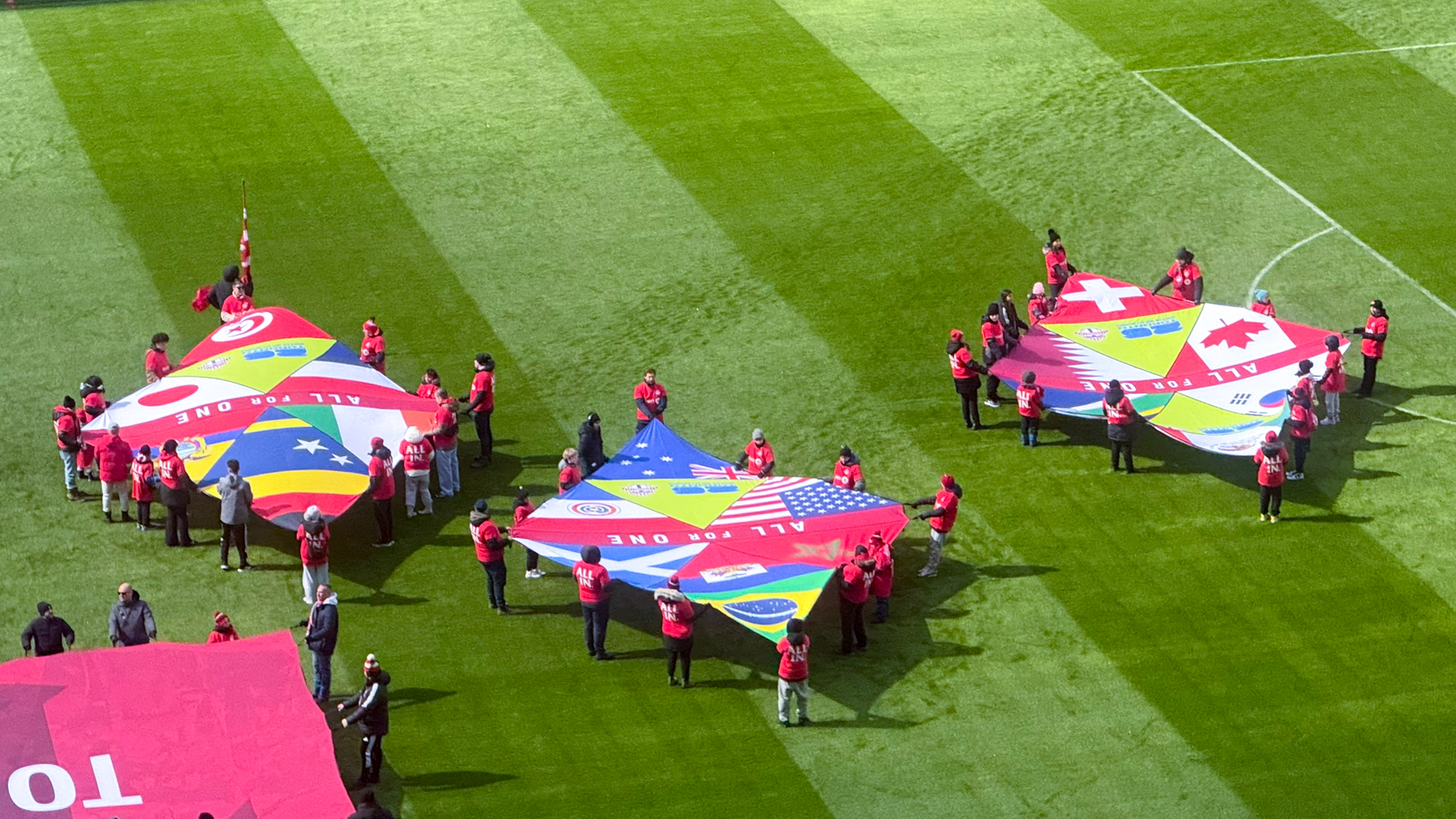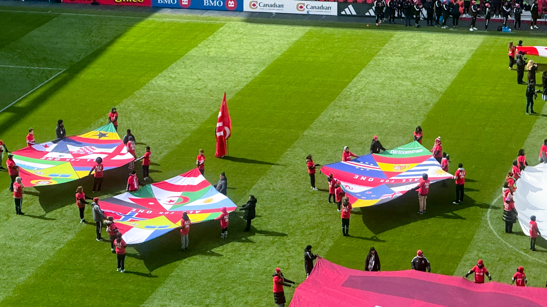 With Toronto preparing to host FIFA World Cup matches this summer, ICON produced flags representing each participating nation. For the opening ceremony portion on match day, both diamond and rectangular on-field flags were fabricated using a soft knit material. This fabric was chosen for its durability, wrinkle resistance, and its ability to allow wind to pass through due to the scale of the flags. Each flag was finished with handle loops so youth participants could carry and hold them comfortably during the ceremony.